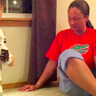A tot boy walks around next to a woman and plays with nail polish. The woman throws the nail polish at the camera man. The nail polish lands in a glass that the man holds and shatters it.