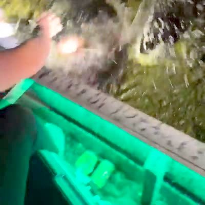 A young boy on his first frogging trip leans over too far in a fishing boat and falls into the water in a pond.