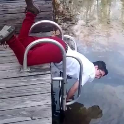 A man stands on the edge of what appears to be a shallow pond, then he tries to cross it, but he falls and disappears completely into the water.
