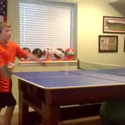 A young boy bounces a ping pong ball on a table and it bounces into a cup. Then he performs a series of ping pong tricks that increase in difficulty.