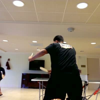 Two teen boys play ping pong each with two paddles and the oldest boy rolls over the table only to have it fold in half and collapse on him.