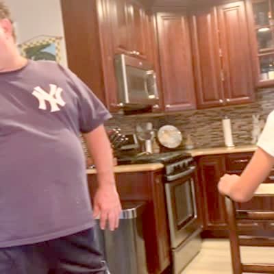 Young, teen boy opens kitchen cabinet and 400 ping pong balls come pouring out.