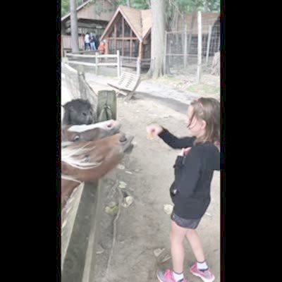 A young girl at a petting zoo holds out some food for some horses. When the horses open their mouths the girl's dad sings so it makes it look like the horses are singing.