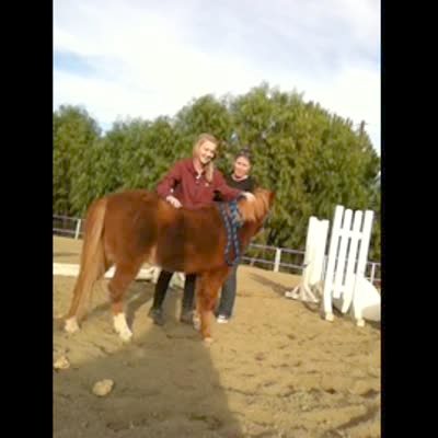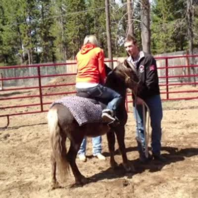 A woman climbs onto a pony horse outdoors when the pony bucks and throws her off.