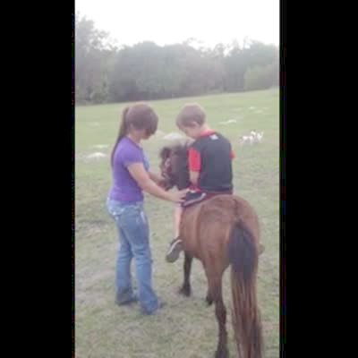 A young boy leads a mini horse around an obstacle course. The horse jumps over obstacle course and pulls the young boy to the ground. Music rights not cleared.