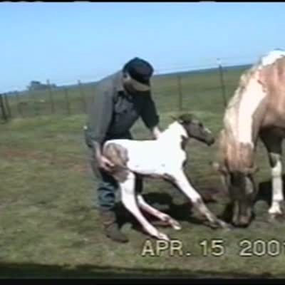 Newborn horse tries to stand up for the first time. Man helps the pony up & horse leans back into man. Man lets go and the horse falls backwards. Farm.