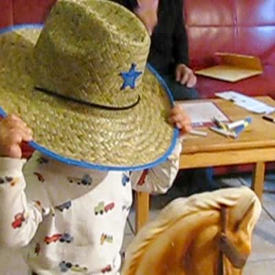 Little boy wearing a cowboy hat rides rocking horse in the living room. His hat bounces into his face.
