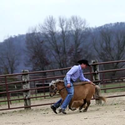 A man climbs onto a pony's back, and then another man hits the horse's backside and it bucks the man off.