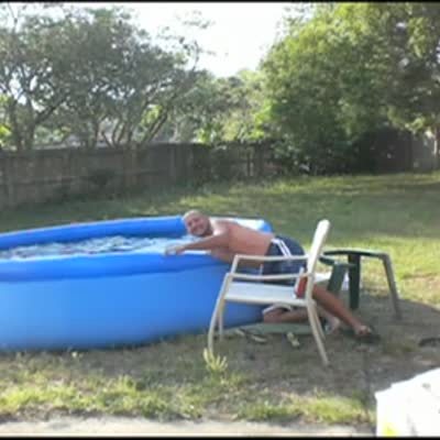 Man stands on a small plastic table. Tries to jump into an inflatable pool, but the table breaks. Man lands on the edge of the pool, his face hits the water.