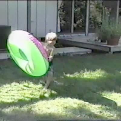 A woman in an inner tube floats to the edge of an inflatable pool and falls out of it into the yard. Security footage.