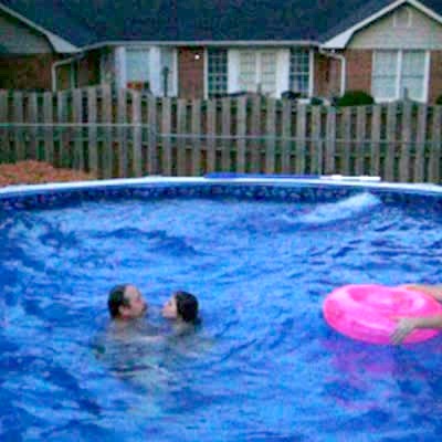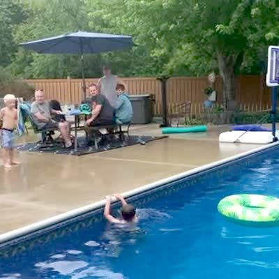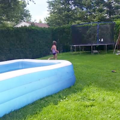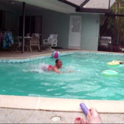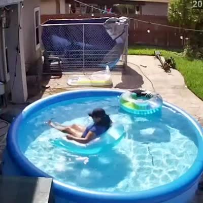 A young boy jumps into a pool, then an inner tube flies onto a senior woman's head in a yard. Security footage.