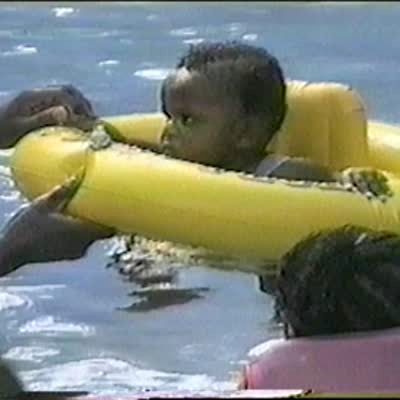 A young boy on a tube in a wave pool at a water park repeatedly says "And now, Tom Bergeron!" Introductions. Good take at :38.