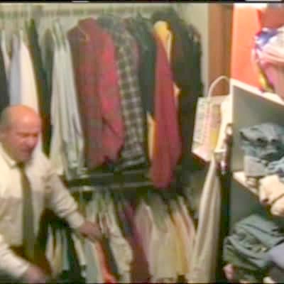 Woman scares her husband by hiding in closet with mask on. Man turns on the light & screams, man is terrified. Practical joke.