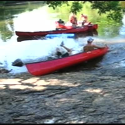Two men slide down a hill in a canoe and the boat suddenly stops when it hits the water's edge. One man is thrown into the lake.
