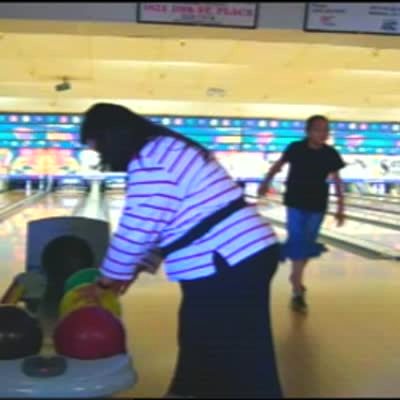 Woman shakes her butt falls into the next lane when throwing her bowling ball. Kids run up to see if she's ok. .