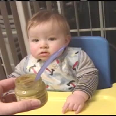 Baby boy in high chair laughs every time his mom says "peas." Cute.