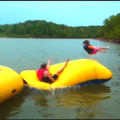 Man jumps on one end of an air mattress and pops a young girl up into the air. She lands in lake water. Girl does a back flip.