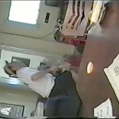 Dad bounces tot boy on his legs and tosses him onto a recliner so hard, the chair falls backwards with tot on it.