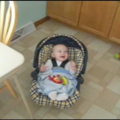 Baby boy has a funny / weird laugh when dad drops a toy on his lap.