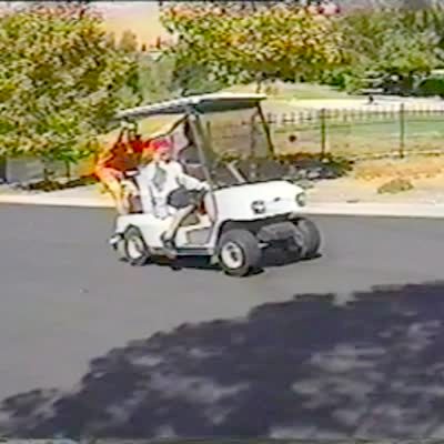 Little boy rides his bike & tries to jump off, the bike keeps going and boy has to chase it down. Low resolution clip, poor qualty.