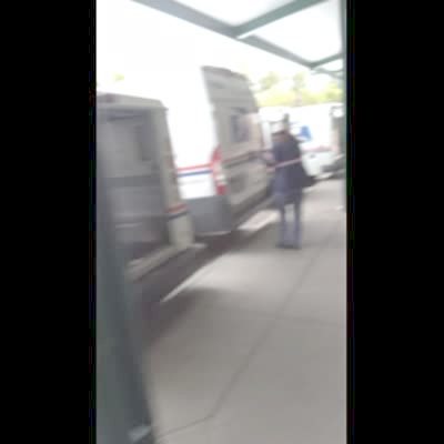 A postal worker opens the back of a mail truck at the post office and gets scared when a fake skeleton pops out.