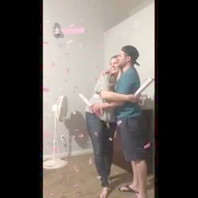 A man and woman pop pink confetti out of canisters for a gender reveal, and in the background their tot son pouts and walks into a dark room.