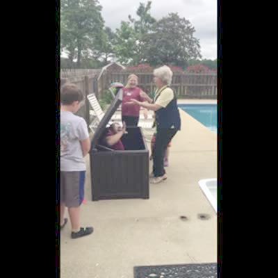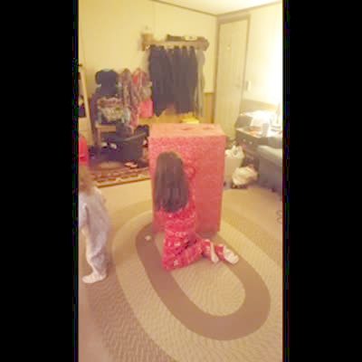 A young girl and her tot sister open a large box for Christmas before their grandma pops out of the box and falls over.