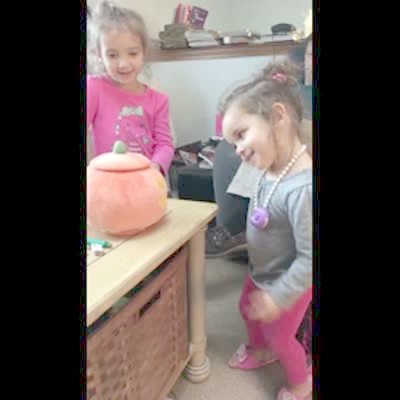 A tot girl is scared when a cat pops out of a singing pumpkin toy. Short tail. Halloween