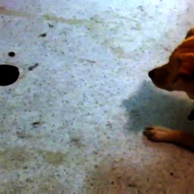 A medium-sized yellow dog paws and barks at a hole in a linoleum floor indoors and gets more spooked when a hand repeatedly pops out of the hole.