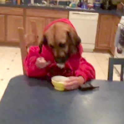A dog's head pops out of a sweatshirt with human hands that feed the dog with a spoon from a bowl