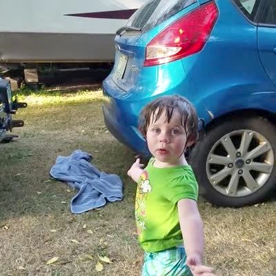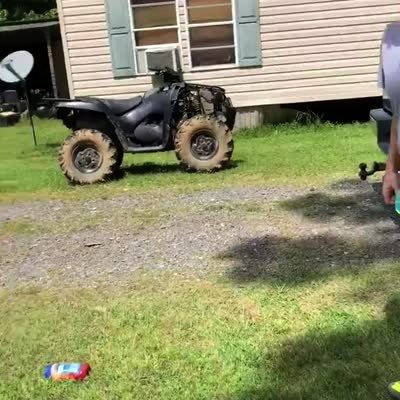 A young boy pops a wheelie on Power Wheels battery-powered car then drives out onto a road. His dad chases after him and the boy lets out an evil cackle at the end of video.