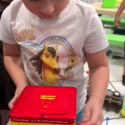 A young boy winds up a Jack in the Box and when it pops out, he sits back in a shopping cart and puts a hand in front of his face in awe.