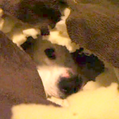 A woman finds a hole torn into her mattress. She gets closer and a white dog pops her head out of the hole before another dog joins her on the bed.