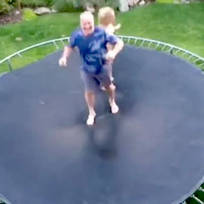 A woman and her dad jump on a backyard trampoline and screws pop out of the trampoline repeatedly. The side of the trampoline breaks and they fall down and laugh.