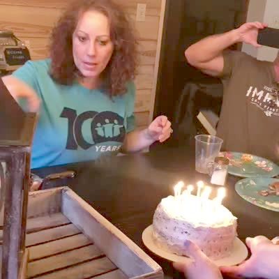 Someone off screen throws a balloon at a woman's birthday cake, it hits the lit candles and pops, then blows the candles out as the woman flinches.