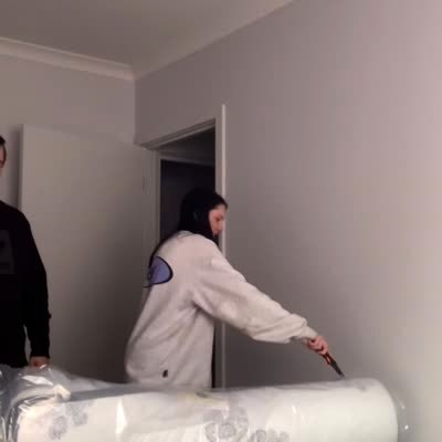 A woman in a bedroom uses a knife to cut open a rolled up mattress in a package and the mattress pops out of the package and knocks the woman down.