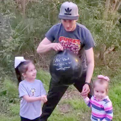 Two young girls pop a gender reveal balloon outdoors and blue confetti spills out. The mom asks "What is it?" - the older girl says that it's a boy and the tot girl says "I don't know!"