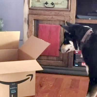 A dog creeps towards a cardboard box under a Christmas tree, and a cat pops out and scares him.