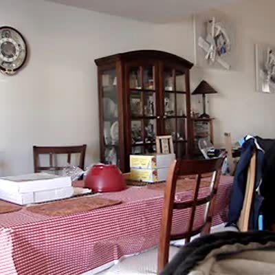 A man hides under a bowl that sits on the kitchen table, and scares a woman when his head pops out.