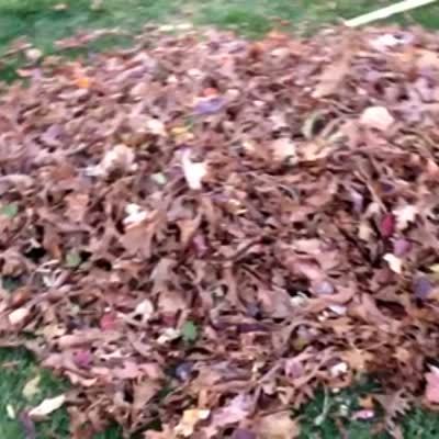 A man films a leaf pile and expects his teen son to be in it. The boy pops out of a trash can beside the leaf pile and scares his father. The boy and trash can fall down when he jumps out of the can.