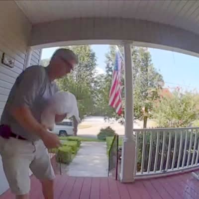 A man spills two drinks at the front door then throws the third on the ground and swears. Security footage.