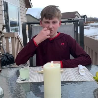 A teen boy brings out food for a young boy to eat and critique on a porch. At the end the young boy takes a bite out of a chocolate cake pop and there is a raw egg inside and he spits it out.