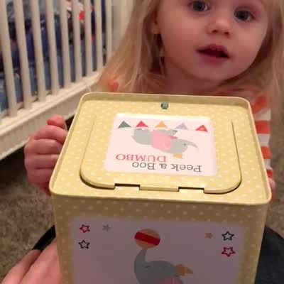 A young girl sings Pop Goes the Weasel, and then pops out of a cardboard box but falls over.
