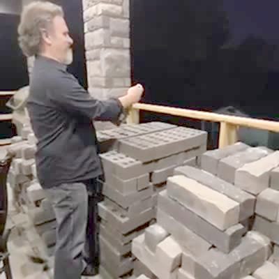 A man pops out of a box, then he scares his coworker and makes him fall down in a construction site. No audio.