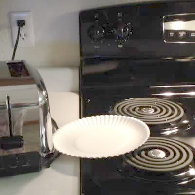 A piece of toast pops out of a toaster on a kitchen counter and it flips and lands on a paper plate.