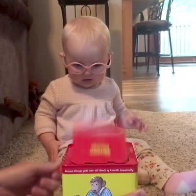 A woman in the living-room cranks a Jack in the Box. When it pops out, the baby boy jumps and shakes as his mom laughs.