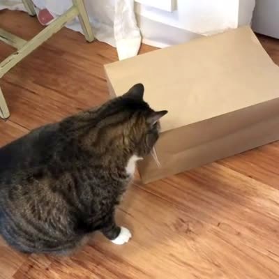 A cat sits and stares at a paper bag, and then he hits it and another cat pops out.