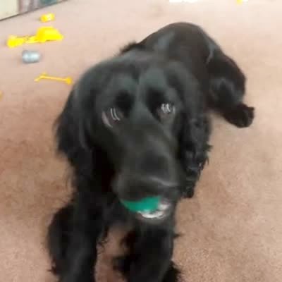 A dog chews on a rubber racquetball until it pops out of its mouth and makes a popping noise.