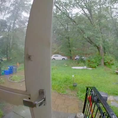 A woman tries to open her umbrella to go out in the rain in a yard, but the umbrella pops off of its handle and falls on the ground. Security footage.