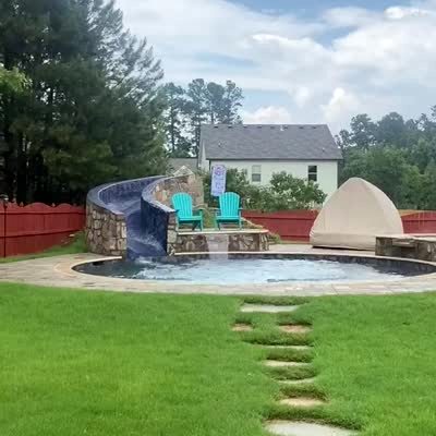 A man pops up out of a swimming pool several times like a dolphin. Then a woman goes over to him and falls in the pool.